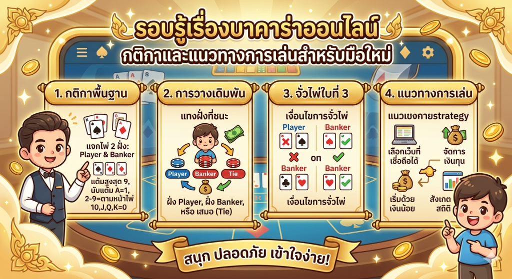 บทความนี้จะพาผู้อ่านไปทำความเข้าใจเกี่ยวกับบาคาร่าออนไลน์ตั้งแต่พื้นฐานของเกม วิธีการเล่น ระบบการเดิมพัน รวมถึงแนวทางการเล่นที่ช่วยให้ผู้เล่นมือใหม่สามารถเข้าใจเกมได้อย่างชัดเจนมากขึ้น